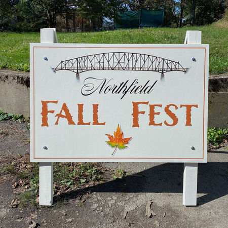 Hand-painted and embellished event sign a-frame. Freehand painted leaf and Schell Bridge embellishment.